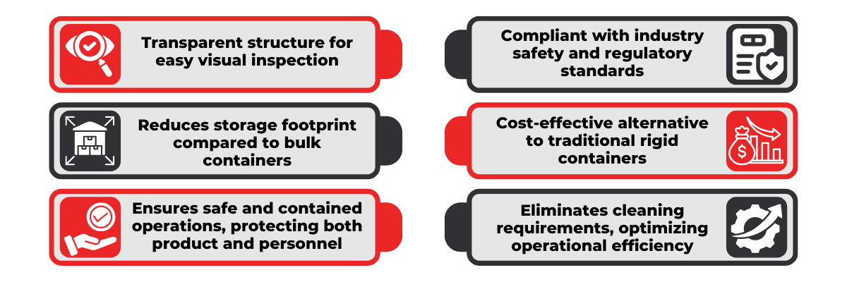The Becto’flex Bottle Bag is a reliable and efficient containment solution designed to enhance safety, compliance, and productivity across pharmaceutical and chemical industries. Its flexible design and ease of use make it an ideal choice for controlled material handling.